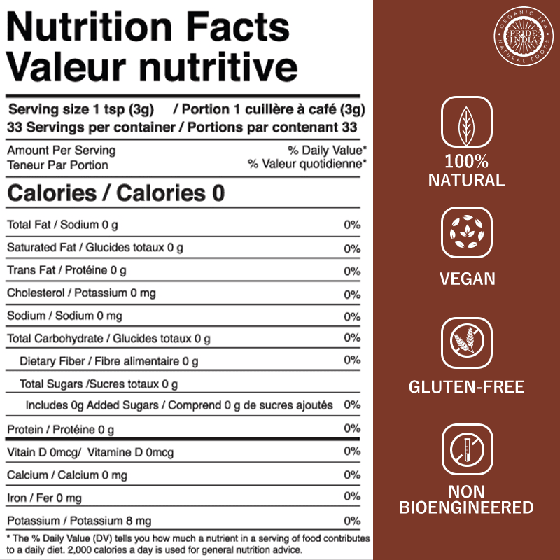 At Pride Of India, we are committed to sourcing the freshest organically grown spices from farms situated around the Indian subcontinent. Our organic and pure spices render a wonderful cooking experience and ignite taste buds while improving overall health as well as balance of the human body. Free From Baddies: Our product is gluten-free, non-bioengineered, cholesterol-free, fat-free, and is a product of India. Enjoy peace of mind knowing that you're using a safe, high-quality ingredient in your cooking.
